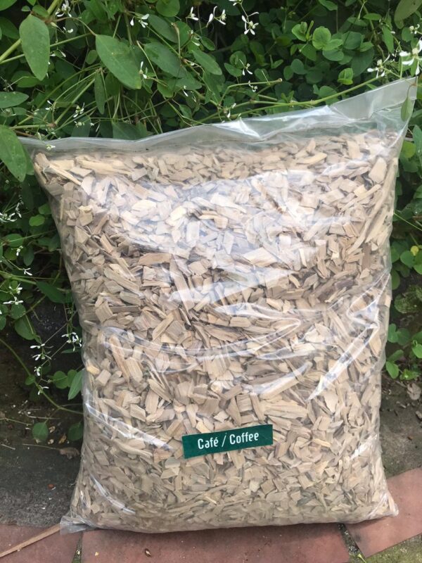 Empaque en bolsa plástica. Elaboración artesanal, chips o astillas de madera de café totalmente seca, sin corteza, sin químicos, totalmente natural y astillada en un tamaño fácil de manipular.