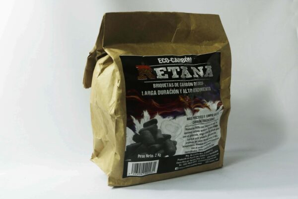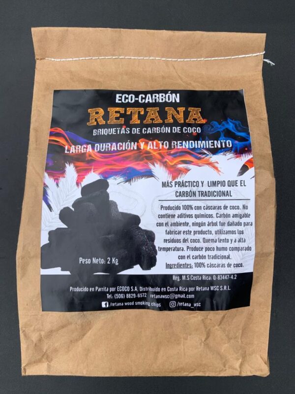 Paquete de carbón fabricada con briquetas de cáscara de coco 100% natural sin aditivos químicos, producto amigable con el ambiente ya que ningún árbol es cortado para este fin. Carbón Briquetas de Coco es más practico y limpio que el carbón tradicional. Este carbón produce poco humo comparado a los demás carbones del mercado y además un aroma natural a coco que es un plus al momento de utilizarlo.