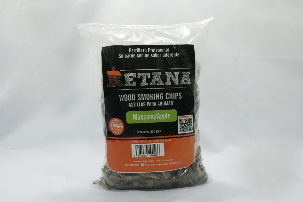 Chips de Manzano, paquete de 500 gramos, tamaño especial para poder alimentar de una forma fácil la parrilla sin tener que levantar el grill. Elaboración artesanal, madera de café totalmente seca, sin corteza, sin químicos, totalmente natural.