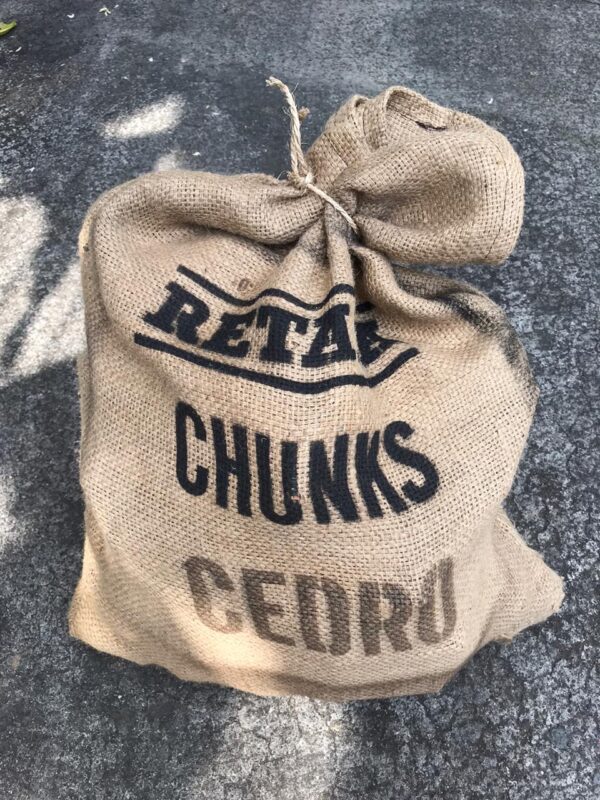 Empaque en sacos de yute. Elaboración artesanal, madera de cedro totalmente seca, sin corteza, sin químicos, totalmente natural y limpia, cortada en trozos gruesos para un ahumó mas duradero y mejor aprovechamiento, especial para hornos.